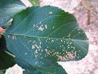 北方果區1年發生3-10代。以受精雌蟲在樹皮裂縫內,粗皮下及地面土縫中越冬,一般6月份之前危害較輕,6月中下旬以后,在高溫干燥的氣候條件下繁殖很快,7月份進入嚴重危害階段,可造成大量落葉,7月下旬至8月上旬,隨著雨季的到來和天敵的增多,蟲口密度逐漸下降,至8月中旬大部分雌蟲已進入越冬場所,有的可延續到9-10月份越冬。