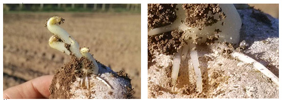 馬鈴薯植株生長及塊莖膨大需要從土壤中吸收大量的養分和水分,根系的發育情況與吸收能力就決定了馬鈴薯植株生長的健壯程度、塊莖的產量和品質。馬鈴薯一般是先出芽,后長根,如果根系生長緩慢,會導致出芽生長不良,莖細瘦、抗病能力弱易感染黑痣病、黑脛病等土傳性病害。因此,促進馬鈴薯根系發育,提高根系吸收能力是馬鈴薯優質高產的關鍵。